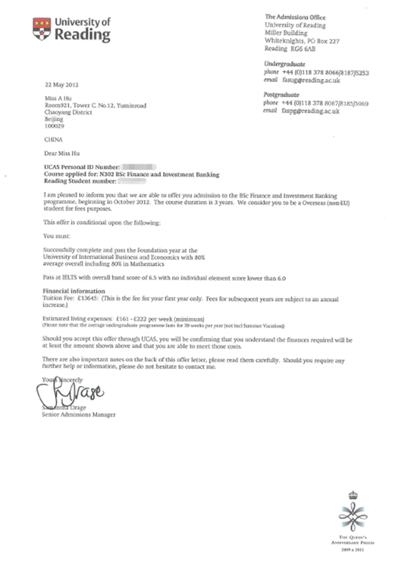 胡阿同学是我项目2011级学生,经过他在对外经贸大学信息学院出国留学预科班一年的学习提升,收获了英国雷丁大学的OFFER。