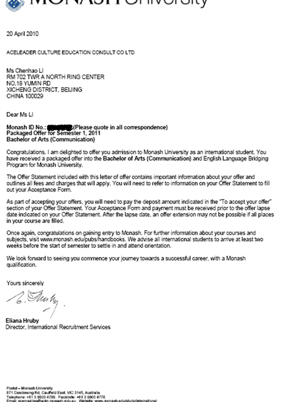 李晨浩同学是我项目2008级学生,经过他在对外经贸大学信息学院出国留学预科班一年的学习提升,收获了澳洲莫纳什大学的OFFER。