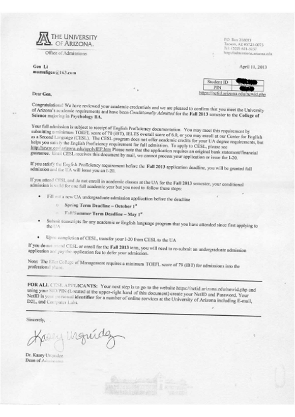 李根同学是我项目2012级学生,在对外经贸大学信息学院出国留学预科班学习一年的时间里,经过他不懈的努力,收获了美国亚利桑那大学的OFFER。