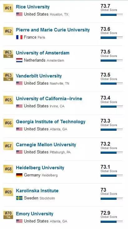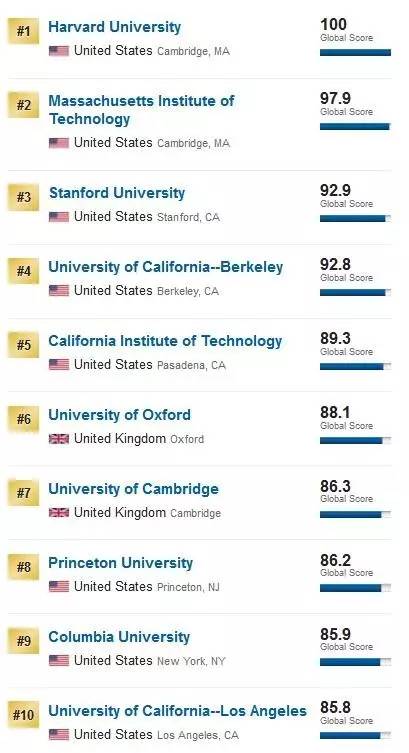 和2016年榜单一样,哈佛大学、麻省理工学院依然位居冠亚军。和去年不同的是,斯坦福和加大伯克利换了个位置。斯坦福上升一位至第三名,伯克利则下降一名。加州理工学院进入Top5。美国大学包揽前五名。英国的牛津、剑桥则落到第六、第七。美国、英国大学包揽排行榜前20位。亚洲排名*一的日本东京大学占据排行榜的44位,紧随其后的亚洲大学是新加坡国立大学(50名)、北京大学(53名)和清华大学(57名)。中国仅有清华北大两校进入排行榜TOP100。