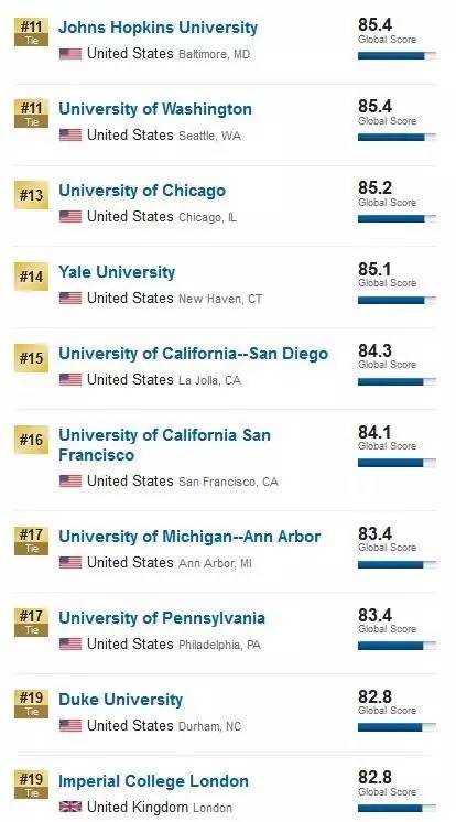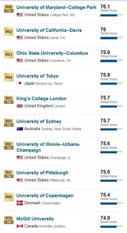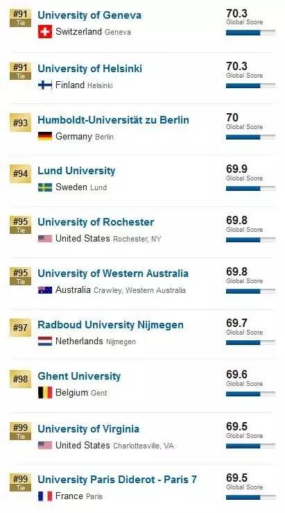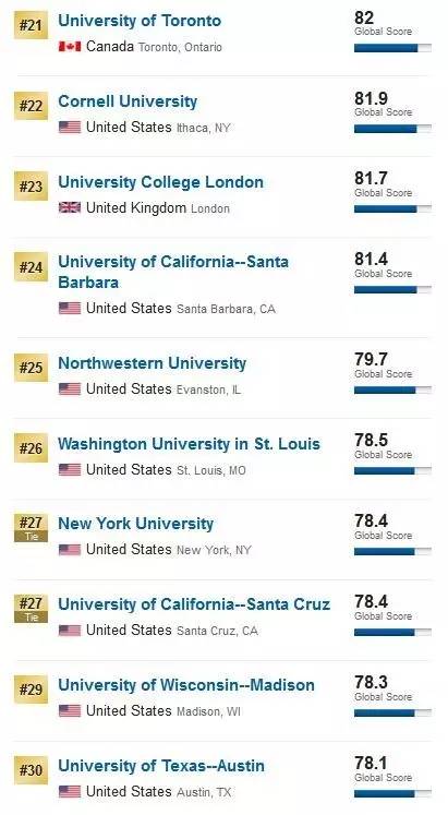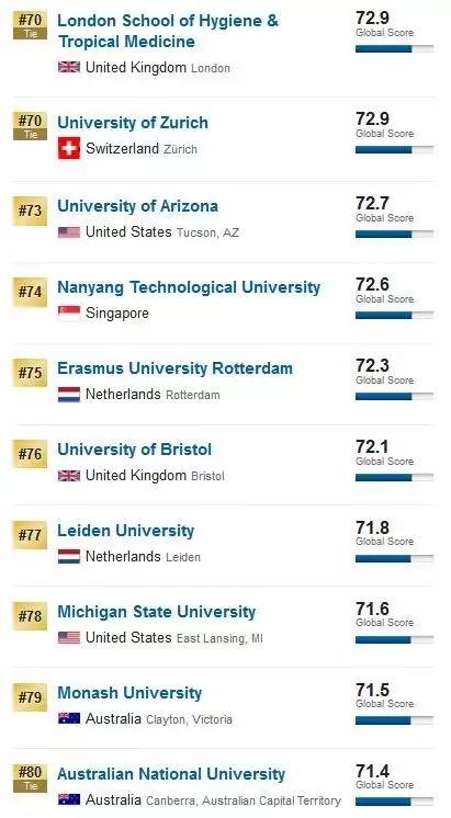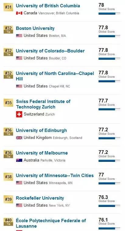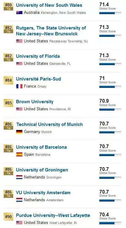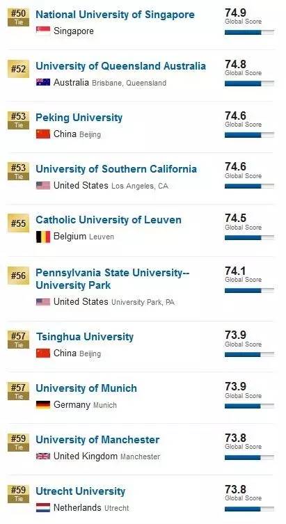 从上表中可以看出,此排行榜对于学术研究实力强大的学校更具偏向性,重点关注机构的研究水平。特别是,排名用指标测量大学的全球和地区的声誉、学术研究的表现、包括文献引用和发表频度的文献使用指标、有关教工和博士毕业生的学校水平的数据。这些排名注重学术研究和声誉,正在寻找合适大学的学生可以自信地推断,一个列入排名的大学拥有很多受尊重的教职人员——这些教授都成功地在同行审查的*级期刊中发表过文章,他们的著作反映了扎实的学术水平,并且推动了一个领域内知识的进展。