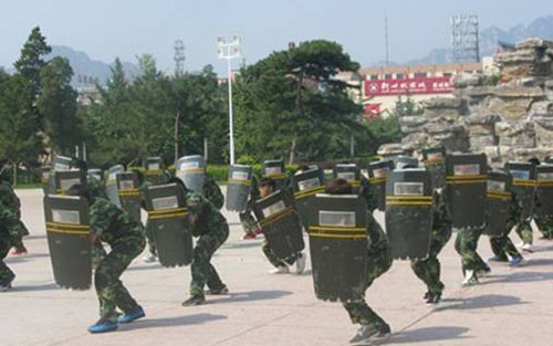 图: 2013级军训男生盾棍术表演