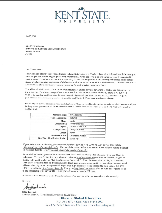 2015年美国肯特州立大学珠宝和金属设计专业录取通知书