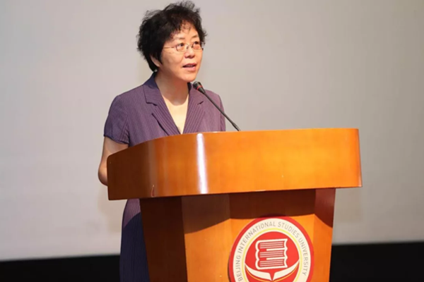 国歌奏毕,首先由北京第二外国语学院朱佩芬副校长带来了特别的致辞,简洁却又不失真心的期许。朱校长送给同学们了三句终生受益的话:读书好,读好书,好读书。九个字中包含了人生选择、珍惜年少时光以及坚持信念的真谛。