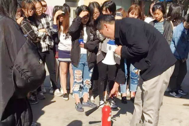 紧急疏散演练活动结束后,在保卫处老师的带领下,在场学生又详细了解到灭火器使用的基本常识、其正确使用方法及灭火的基本要领和注意事项。
