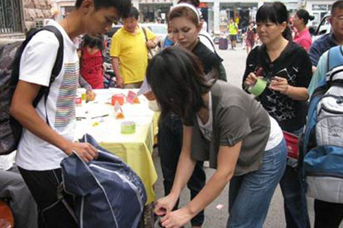 图:王老师在细心地为学生的行李贴标签