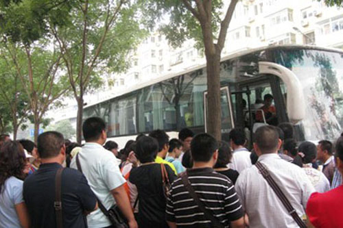 图:学生们上车去军训基地