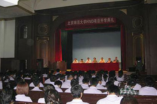 9月13日上午九点,北师大2011级HND新生开学典礼在辅仁礼堂准时拉开序幕,北京师范大学继续教育及教师培训学院院长包华影教授、副院长刘长旭、曾文艺、副院长韩冰、院长助理纪会议老师、HND项目中心主任卓举纲老师等领导出席了本次典礼,HND项目的部分代表教师以及全体2011级新生也悉数到 场。本次开学典礼由曾文艺副院长主持,他宣布典礼开始之后,庄严的国歌立刻响彻礼堂,穿着统一服装的2011级师生共同深情地演唱国歌。这是一个激动人心 的时刻,因为在今天,所有2011级新生在国歌声中真正走进了人生中的大学殿堂,也在今天,北师大HND又注入了一股年轻的血液,开始了一场新的生命旅 程。