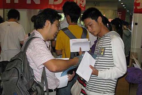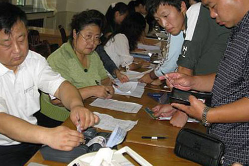 图:学生和家长在准备报到材料