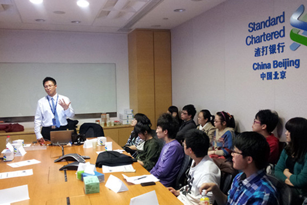 下午,分别由中关村支行的客户理财经理张岩、分行优化业务销售张翔以及行长张永新为同学们介绍了风险控制与如何规避财务风险、财富管理与资产配置以及进入渣打银行的从业人员要求。