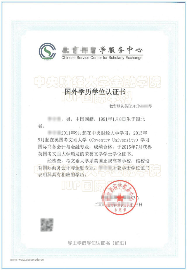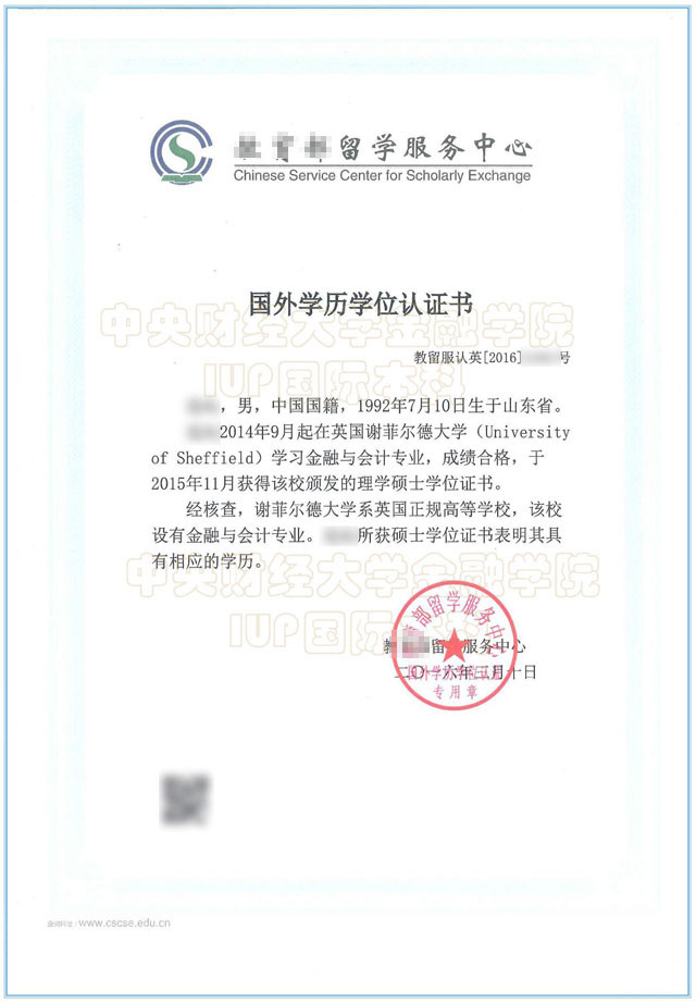 中央财经大学金融IUP学生回国后学历认证书内容为:“xxx同学,自x年x月x日——x年x月x日在中央财经大学学习,自x年x月x日——x年x月x日在x国xxx大学学习xxx专业大学本科课程,经查x国xx大学是中国认可的正规大学,xxx获得学士(硕士)学位表明其具备相应学历,经查无误。”