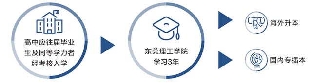 学生在东莞理工学院学习三年,以开设英语基础课程、国际化通识课程和专业素质课程为主,获得国家承认专科学历。三年学习期满,根据学生意向进行双向选择。选择国际教育课程对接亚洲国家合作院校,继续攻读本科学位,符合国外院校毕业要求的可获得国外院校的学士学位;同时可选择参加国家教育*统筹下的专插本等其他升学途径继续完成本科阶段学习。
