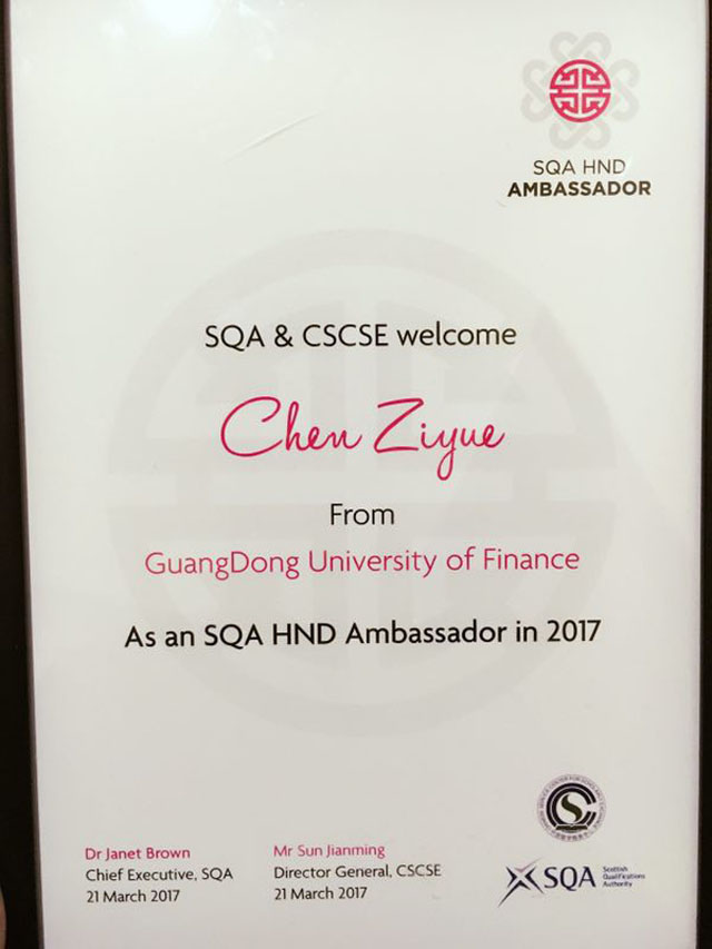 SQA-HND理想大使是该项目*优良学生的荣誉称号,强调入选学生的综合素质,包括个人成绩、道德修养以及为人处事能力等各方面的要求。广金学子陈梓岳同学在2017年获此殊荣。该同学是我校2016级SQA  HND 国际本科(3+1)项目的学生,作为班干部不仅以身作则,并且兴趣广泛,喜交朋友,有非常强的沟通协调能力,得到了我校以及中英SQA HND项目举办方领导、老师与同学们的充分认可。