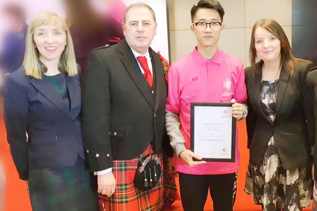 陈梓岳同学与苏格兰学历管理委员会Alistair Shaw先生(左一)