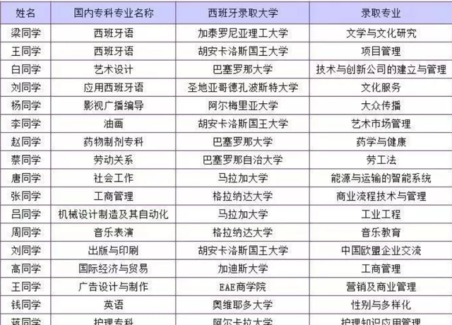 西班牙认可大专学历可直接申请与本专业相关相近的硕士课程,但每个学校的录取政策有所不同。对于大多数西班牙大学来说,在硕士录取时会优先考虑条件优良的专科生。因此为专科生推荐的学校为公立大学中的部分有条件录取专业、西班牙城市周边地区的公立大学、公立大学的附属学院、以及中国教育*同样认可的优良私立大学。