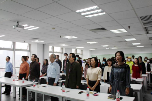2020年9月25日下午,上外贤达学院2020级新生开学典礼在行政楼报告厅隆重举行。上外贤达学院执行董事长李进、校长张定铨、党委书记夏骄雄等校领导出席了本次典礼。会议由党委书记夏骄雄主持。与往年不同的是,因为疫情缘故,今年的新生开学典礼采取了线上与线下、主会场与分会场相结合的方式,各学院和职能部门领导、教师代表、学生代表等参加了典礼仪式,线上向全体新生进行直播。在崇明校区分会场,国交学院的师生们早已坐好,满怀期待的注视着大屏幕,等待大会开幕。