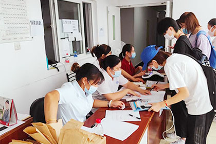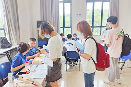 在校门口等待已久的新生,在现场工作人员的指导下,有序地进入校园。装备齐全的工作人员及志愿者早已等候着大家,一测二核三查,有条不紊,一气呵成。