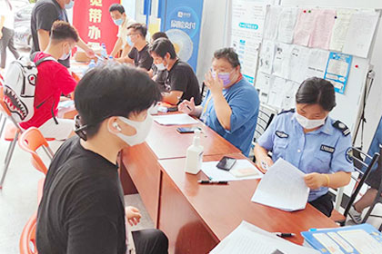 学校为外地来沪学生们提供了免费核酸检测,学生们有序排队进场。