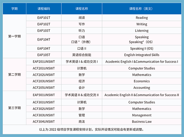 学生入学后直接进入新南威尔士大学预科标准课程,从2022年9月-2023年12月,共3个学期。结业时学生须完成规定的必修课程,并取得专业课成绩(GPA成绩)和达到澳大利亚大学本科英语入学水平(学术英语C+/B或雅思6.5分以上)。