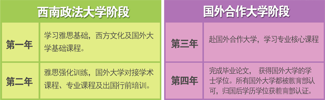 国内阶段所有课程由西南政法大学负责授课,主要包括语言培训课程、桥梁课程和可获外方合作院校学分豁免的专业课程(豁免学分比例不超过学位课程总学分的1/3)。学员在国内学习2年,顺利完成规定课程,成绩达标,雅思成绩达到相关要求后进入英国、美国、澳大利亚、加拿大等国外合作大学继续学习2年,完成学业后由国外合作大学授予学士学位,学员还可以在此基础上继续申请攻读硕士学位。