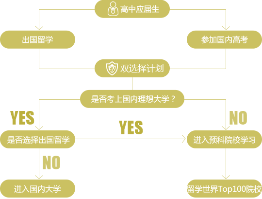 高考留学双选择"是与国内大学共同针对中国高三学生量身打造的"一手高考、一手留学"项目,在高三学生准备国内高考的期间,报名申请国内大学留学预科课程,并有大学留学预科为就读海外大学作准备,以便在国内高考结束后视录取情况选择就读国内院校或是海外大学,从而避免在准备高考期间又准备留学,两方面都准备不足,高考和留学都受到影响而错过选择的情况,真正做到高考、留学两手抓的双选择。