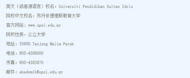 苏丹伊德里斯教育大学(Universiti Pendidikan Sultan Idris,简称 UPSI),成立于1922 年11月29日,马来西亚*一所也是一所师范类国立大学,具有王室背景,是亚洲八大师范茗校,美国华盛顿学术联盟成员。2021QS 亚洲排名#281-290位,地位等同于北京师范大学。学校坐落于霹雳州首府怡宝近郊的丹绒马林小镇,地处吉隆坡北部。